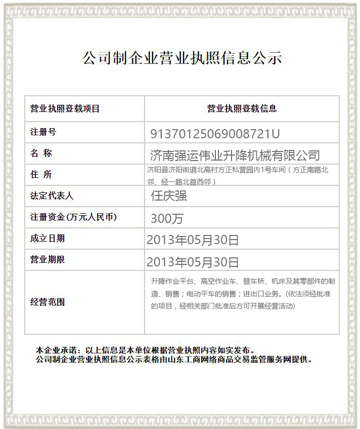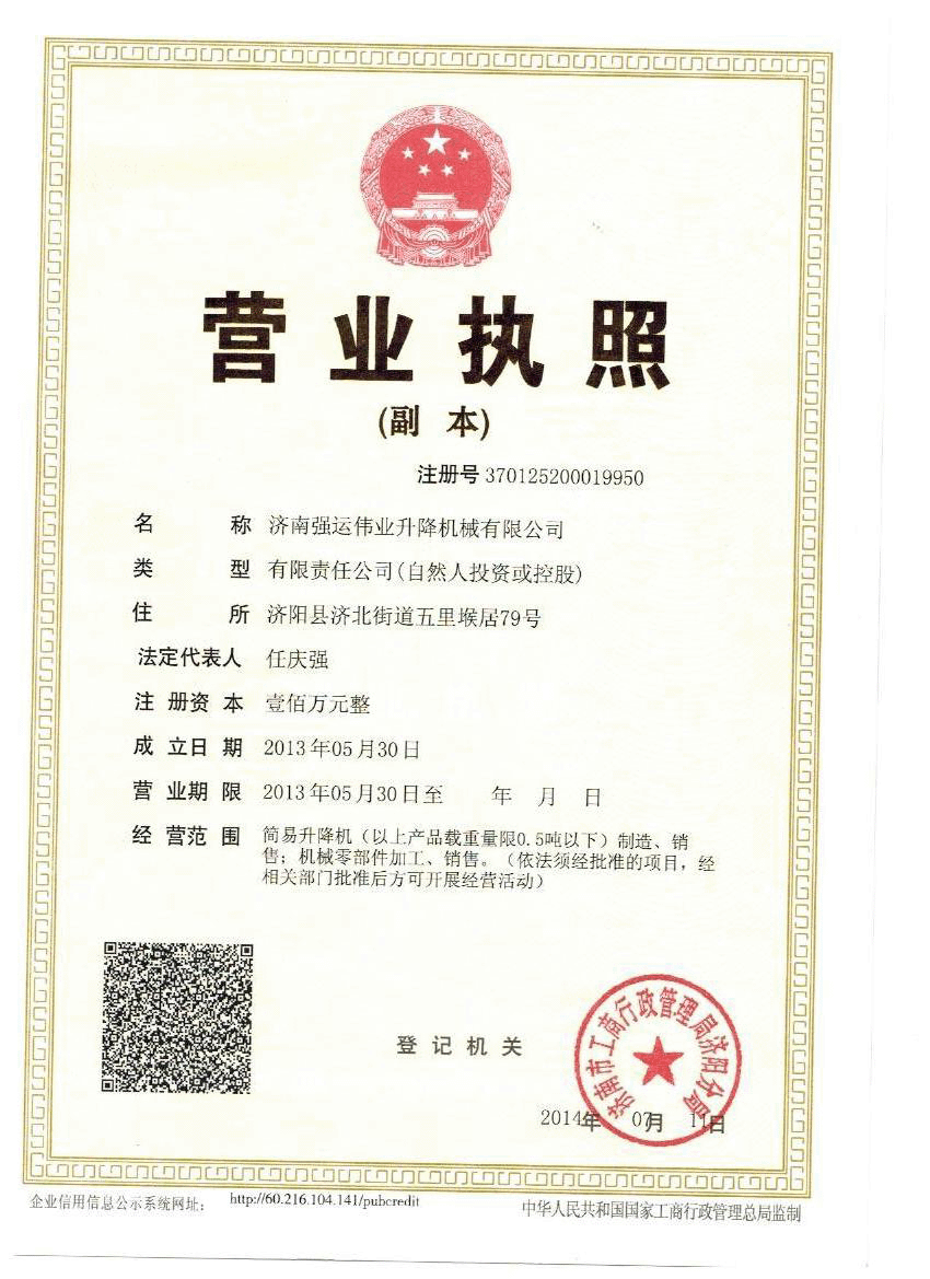 濟(jì)南強(qiáng)運(yùn)偉業(yè)升降機(jī)械有限公司位于液壓設(shè)備制造之鄉(xiāng)——濟(jì)南,是全國(guó)生產(chǎn)、制造液壓升降平臺(tái)和物流搬運(yùn)的專(zhuān)業(yè)生產(chǎn)廠(chǎng)家之一。本公司宗旨是“誠(chéng)信為本、科技創(chuàng)新、質(zhì)量第一、用戶(hù)至上”的經(jīng)營(yíng)理念,生產(chǎn)出優(yōu)質(zhì)產(chǎn)品,服務(wù)社會(huì)。 公司現(xiàn)生產(chǎn)升降機(jī),升降平臺(tái),殘疾人升降機(jī),殘疾人升降平臺(tái),無(wú)障礙升降機(jī),無(wú)障礙升降平臺(tái)液壓升降機(jī)、液壓升降平臺(tái)、固定式升降機(jī),固定式升降平臺(tái),鋁合金升降機(jī),鋁合金升降平臺(tái),導(dǎo)軌式升降機(jī),導(dǎo)軌式升降平臺(tái),自行式升降機(jī),自行式升降平臺(tái),車(chē)載式升降機(jī),車(chē)載式升降平臺(tái),登車(chē)橋,移動(dòng)式登車(chē)橋,固定式登車(chē)橋,高空作業(yè)平臺(tái)等多種系列的高空作業(yè)平臺(tái),液壓升降平臺(tái)主要有五大系列六十多個(gè)品種,產(chǎn)品遍布全國(guó)各地,在同行業(yè)中名列前茅。其中剪叉式、套缸式、屈臂式、牽引式、鋁合金式、導(dǎo)軌式升降機(jī)......